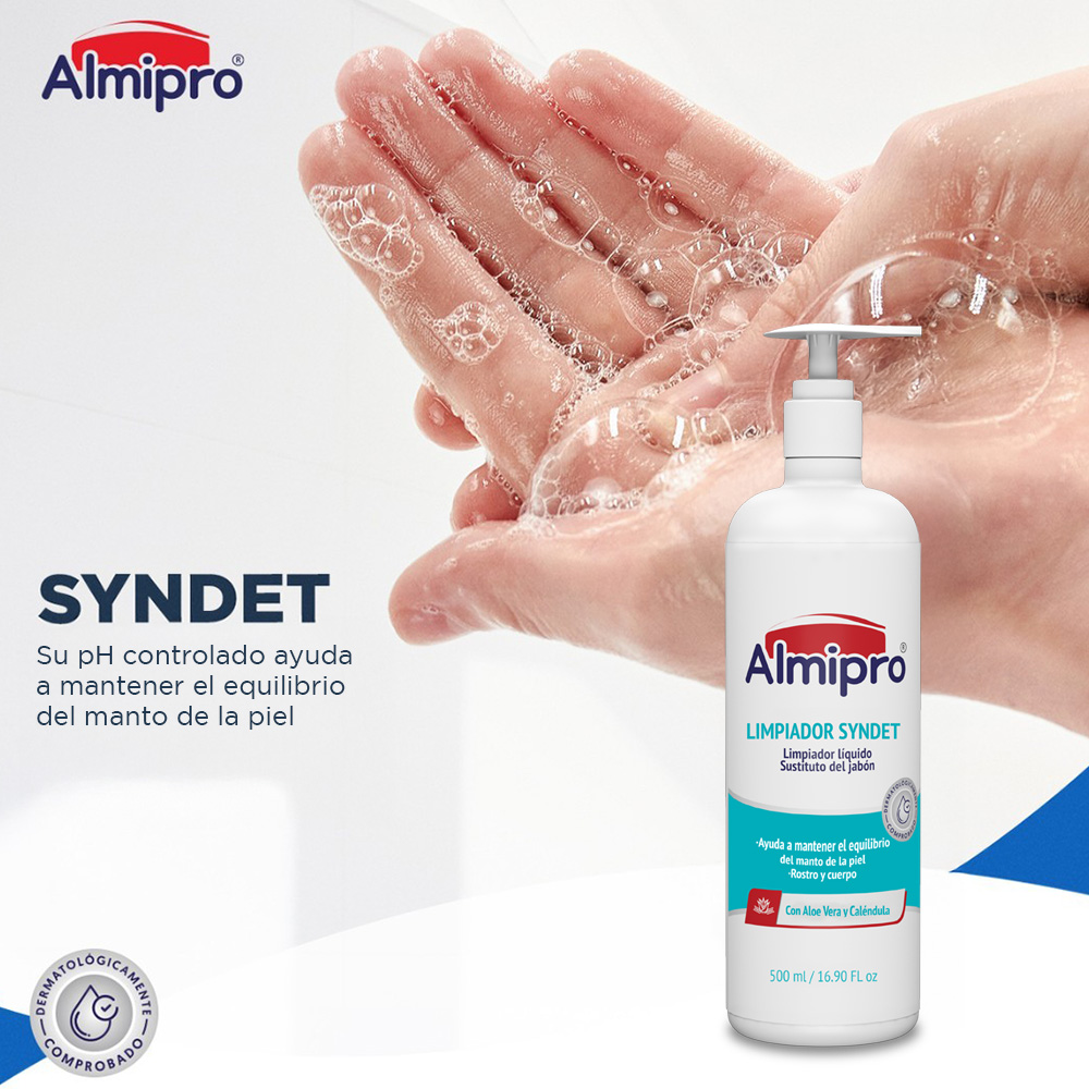 El limpiador líquido Almipro Syndet es un sustituto del jabón, diseñado para respetar el pH natural de la piel, lo que ayuda a mantener su equilibrio. Esta fórmula dermatológicamente comprobada, cuenta con todas las propiedades de los extractos de Aloe Vera y Caléndula 100% colombiana, ayudando a proporcionar hidratación y suavidad a la piel.